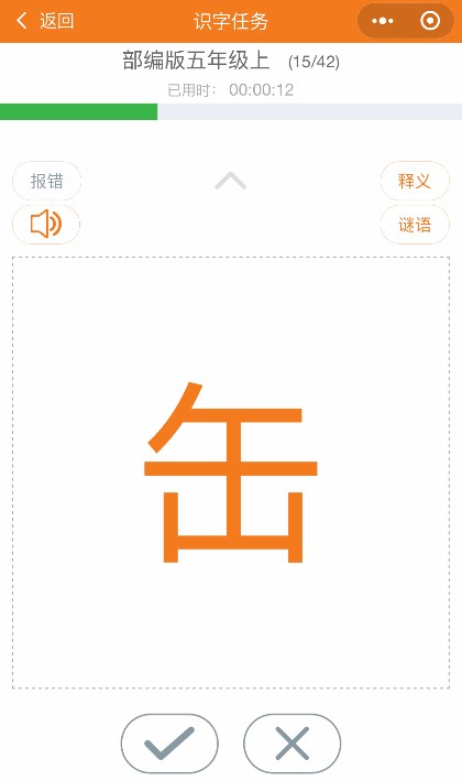 在优优识字中,每个复习的生字都是采用卡片式复习方式,先展示这个字的字形,让孩子主动回忆起这个字的字音。当回忆之后,可以点击听读音、查看卡片的相关知识,这样一来,每次复习都是一次主动学习。