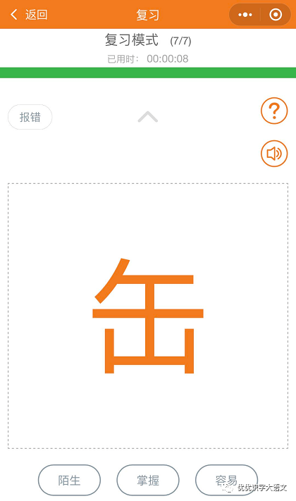 先自己回想这个字的读音(主动记忆),然后可以点击下面的“陌生”、“掌握”、“容易”,孩子可以根据自己的掌握程度来选择,掌握程度越好,下次复习的间隔时间越长。